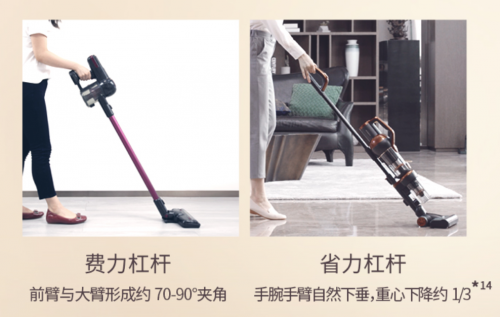 這種設計其實是利用了杠桿原理,符合人體工程學的設計將吸塵器的本體放在機體偏下的位置,使得重心下降了三分之一。