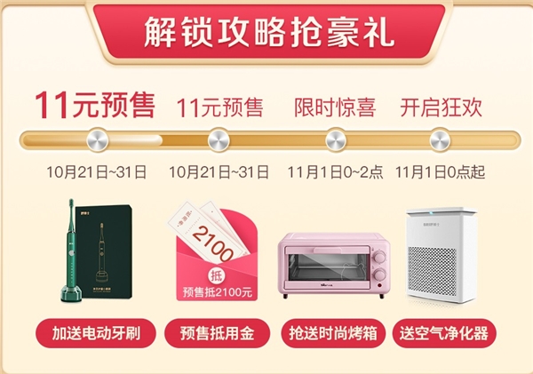雙十一狂歡盛宴直擊底價,3年保修,1年價保,還享受24期白條免息!即日起-10月31日,11元預售加送電動牙刷,即抵2100膨脹金并加送1600元大額券。11月1日0-2點搶購送時尚烤箱驚喜好禮,購機還送高端空氣凈化器,關注加送京魚座智能音箱,曬單還有按摩椅防塵罩可拿,豪禮拿到手軟的節奏!
