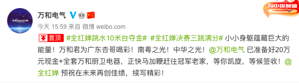 家電消費(fèi)網(wǎng)8月6日訊 “小小身軀云倉巨大的能量!萬和君為廣東杏哥喝彩!南粵之光!中華之光!”今天,廣東萬和新電氣股份有限公司宣布,將向東京奧運(yùn)會(huì)女子跳水10米臺冠軍全紅嬋獎(jiǎng)贈(zèng)現(xiàn)金20萬元及全套廚衛(wèi)電器。