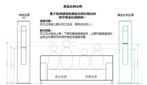 舒適黑科技一:黃金比例組合氣流技術。數據統計顯示,我國8歲以下小孩的身高普遍在1.3米以下。另外,成年人坐在沙發上的高度普遍也在1.3米以下。設計人員在充分數據分析的基礎上,創造性地設計出具備上下兩個出風口且符合人機功效學原理的黃金比例空調柜機。