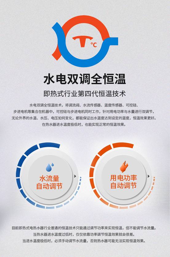 水電雙調全恒溫,自動調節用電功率,自動調節用水流量,恒溫效果更好。目前同行大部分的即熱式產品在恒溫技術上都是采用變頻恒溫,只能調節用電功率,不能調節用電流量,所以冬天的時候必須要用手動調節水量才能實現恒漸效果。普通恒溫技術就如同手動檔汽車,進水溫度過低時需要手動去調節水流量;水電雙調全恒溫技術就像是自動檔汽車,自動控制用電功率與水流量,是目前行業內高端的恒溫技術。