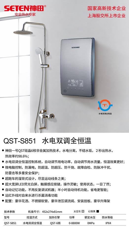 神田S851在發熱技術上是硅晶加熱,在恒溫技術上是水電雙調全恒溫,面板采用超跑車的溜背式設計,超大寬屏LED熒光白屏。S851也具備自動記憶功能、半小時自動待機功能等智能化功能。