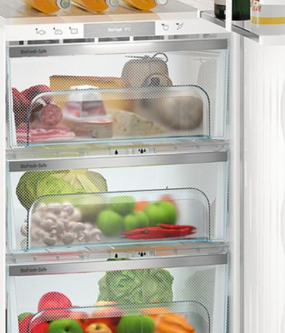 與傳統冰箱相比,BioFresh生物養鮮技術已經證明可顯著延長食材的保鮮時間。Super cooling triplet在冷藏室內設有多個BioFresh生物養鮮抽屜,可利用電子控制系統始終保持剛好0 °C之上的理想溫度。不僅如此,每個抽屜內設置有獨立的濕度控制面板,用戶通過滑動標尺可在HydroSafe“濕度最大”DrySafe“濕度最小”之間任意調節,選擇最合適的濕度儲藏食品,像是蔬菜、水果適合儲存在較高的濕度之下,而海鮮與肉類則適合較為干燥的環境。