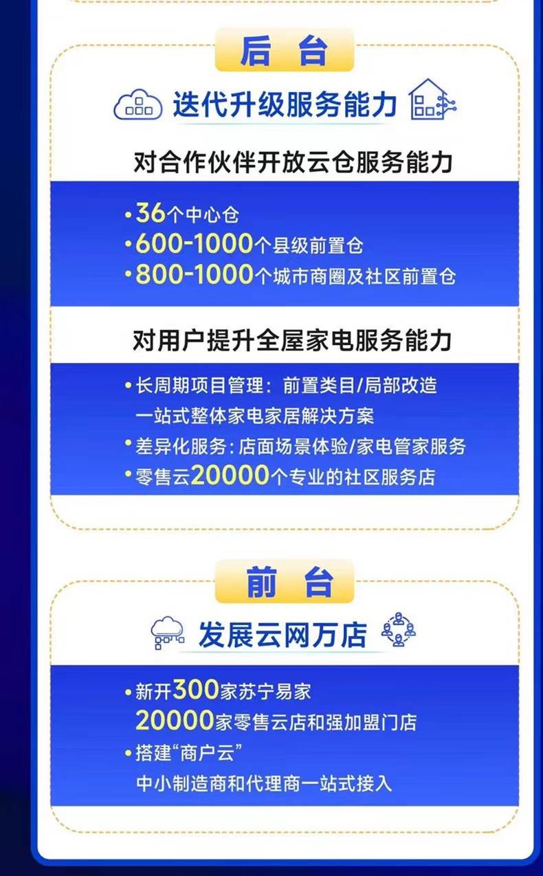 在服務進化方面,蘇寧易購將升級兩大服務能力。一是對合作伙伴的云倉服務能力。蘇寧將對36個中心倉全面開放,建設600-1000個縣級前置倉,提升消費者的服務響應能力,降低農村市場物流配送成本;建設800-1000個一二線城市商圈及社區前置倉,提升3C和生活電器的即時服務能力。二是對用戶的全屋家電服務能力。蘇寧將為用戶提供一站式家電家居解決方案,零售云進一步發展專業的社區服務店,提升服務與體驗能力。