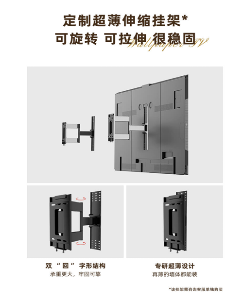 A7E系列作為全新一代壁紙電視也為用戶提供更加美觀的安裝方案,無論是直接掛墻還是嵌入掛墻,都能讓電視嵌入嚴絲合縫,不留空隙。A7E系列定制了專屬的內嵌方案,9mm超薄伸縮掛架,實現了⾏業內含伸縮掛架的最薄上墻厚度,同時掛架還有旋轉功能,輕輕一推即可自動伸出,實現零嵌不是夢。