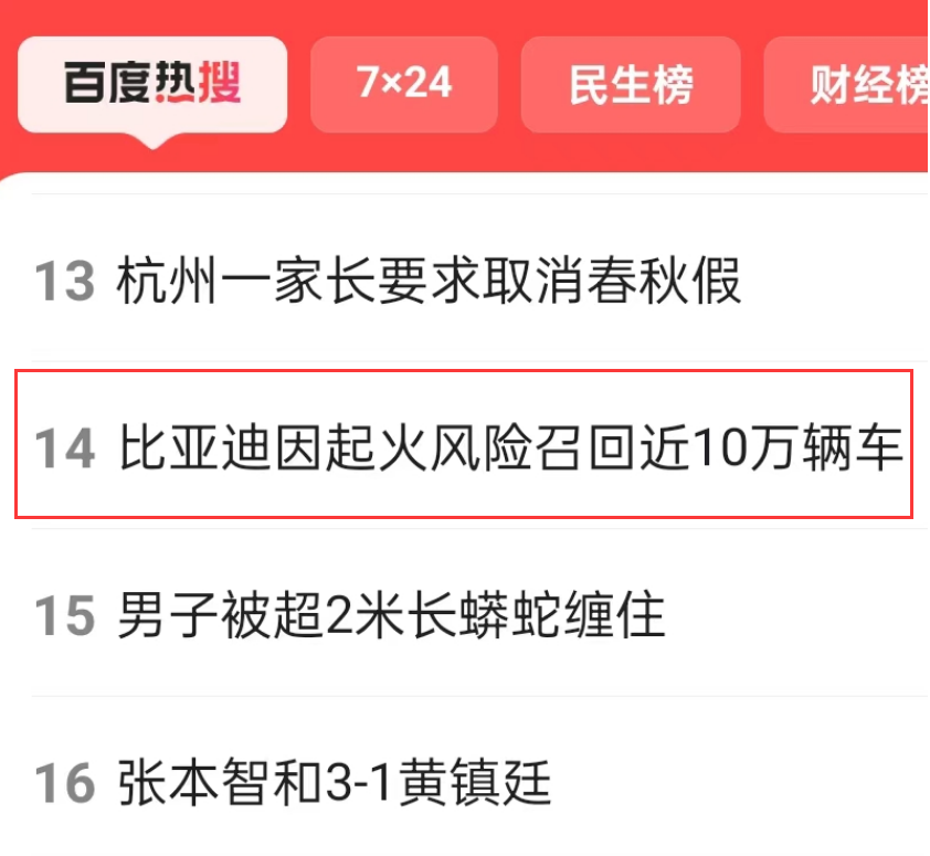 “比亞迪因起火風險召回近10萬輛車”沖上百度熱搜