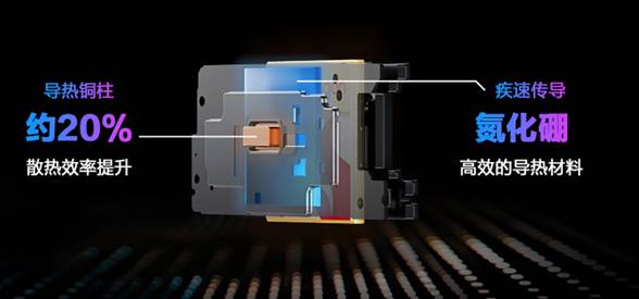 隨著游戲畫質的不斷攀升,對手機性能提出更高要求的同時也面臨更大的散熱壓力,ROG對此也在不斷得迭代創新散熱架構。此次全新升級的矩陣式液冷散熱架構8.0在保持SoC中置架構的基礎上,運用了獨特的極速傳導冷卻技術進行高效散熱,其通過在主板上打孔,并置入導熱銅柱,可直接將SoC的熱量傳導至整個背面,再搭配氮化硼散熱材質,整機的散熱效率可提升20%,無論是短時激烈團戰,還是長久游戲競技,都能壓制住SoC熱量,實現持久滿幀暢玩。