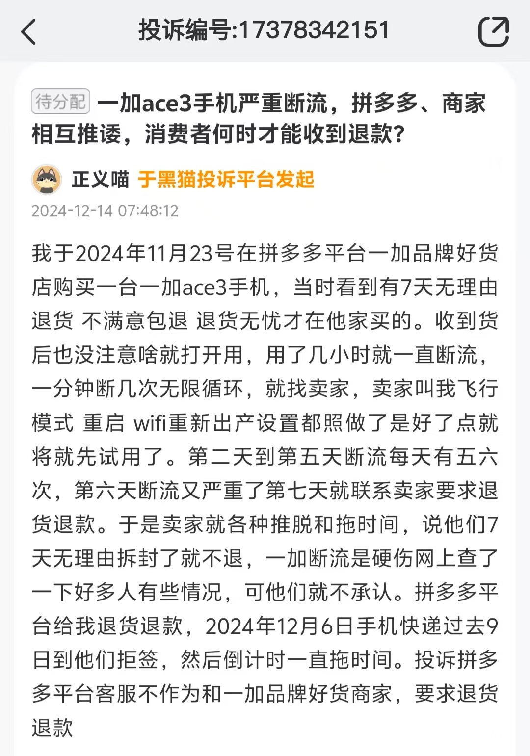 “一加斷流是硬傷,我上網查了一下好多人使用都是這樣,但是一加不給退貨退款。”該消費者向黑貓投訴平臺說。