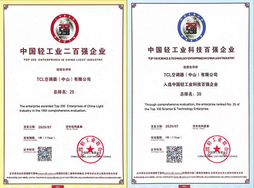 TCL空調(diào)同時入選中國輕工業(yè)科技百強(qiáng)與中國輕工業(yè)二百強(qiáng)企業(yè)