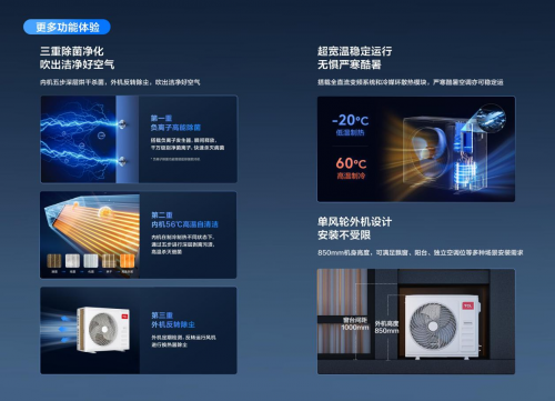 此外,TCL真省電小多聯(lián)還具備三重除菌凈化科技,包括負(fù)離子高能除菌、內(nèi)機(jī)56℃高溫自清潔、外機(jī)自動(dòng)除塵三重凈化科技,從根本上保障家中空氣潔凈。其搭載全直流變頻系統(tǒng)和冷媒環(huán)散熱模塊,能實(shí)現(xiàn)超寬溫穩(wěn)定運(yùn)行能實(shí)現(xiàn)60℃高溫制冷,-20℃低溫制熱,無(wú)懼嚴(yán)寒酷暑。