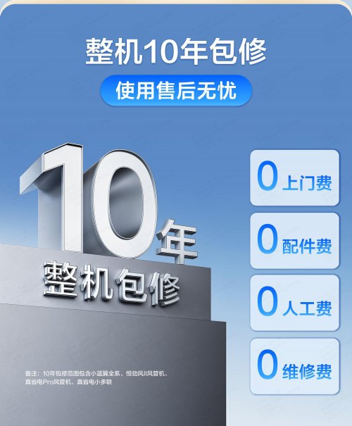 值得關注的是,凡是購買小藍翼系列家庭中央空調的用戶可尊享小藍翼專屬VIP服務權益 —— 整機10年包修保障(免上門費、免配件費、免人工費、免維修費)福利。質保期內,內外機任何質量問題均0付費維修,徹底消除用戶后顧之憂。