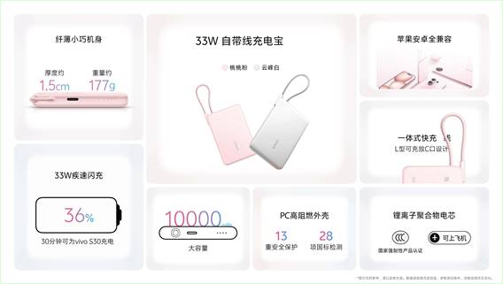 同時 vivo 10000mAh 33W 自帶線充電寶正式發布,上市價格 129 元,6 月 6 日正式開售,6 月 18 日前搭配S30系列手機組合購買僅需 89 元。