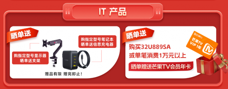 此外,購買顯示器32U889SA型號或任意IT產品單筆消費滿1萬元以上,并曬單評價的顧客,還將額外獲得芒果TV會員年卡一張(該活動不與前兩項曬單活動同享)。贈品數量有限,機會不容錯過。