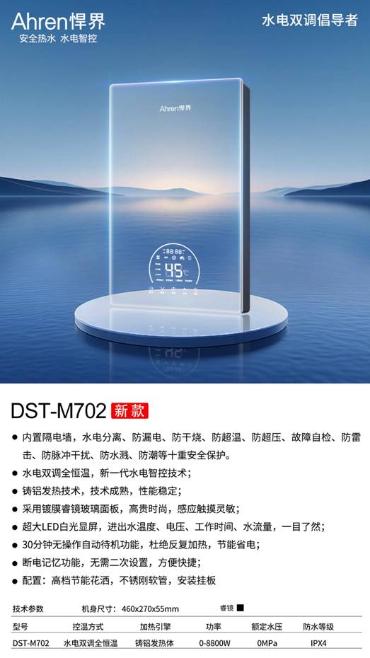 Ahren悍界DST-M702采用的高端的“鑄鋁發熱技術+水電雙調全恒溫+大屏幕顯示+內置隔電墻”的產品平臺,內置隔電墻,應用了防漏電、防干燒、防超壓、故障自檢、防雷擊、防脈沖干擾、防水濺、防潮等多種安全保護,確保產品的安全。大屏幕顯示,電壓、進水溫度,出水溫度、水流量一目了然。M702面板采用了高端的睿鏡鍍膜玻璃面板,具備鏡子一樣的效果。