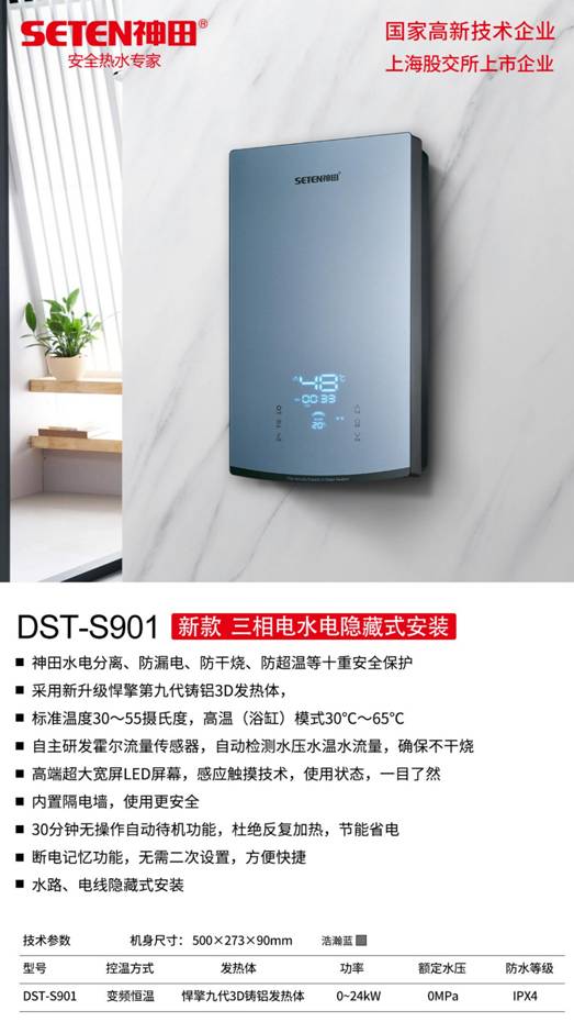 2025年6月,神田集團高端系列三相電即熱式電熱水器S901正式上市,同時也推出了功率為1.2萬瓦的單相電產品。