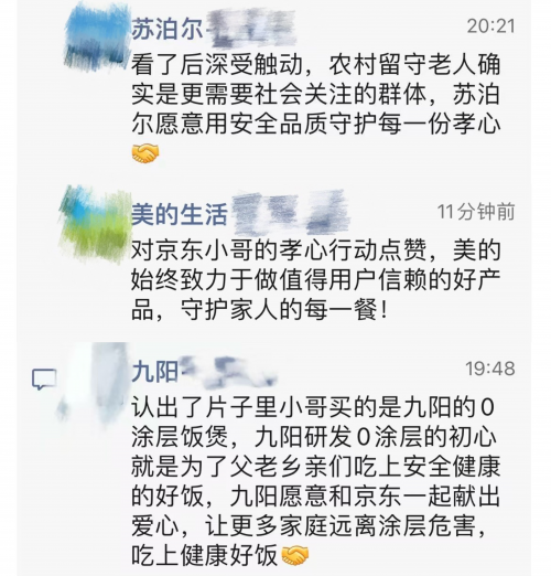 截圖顯示,美的相關(guān)負(fù)責(zé)人在回應(yīng)中為“京東小哥”的孝心點(diǎn)贊,并表示“美的始終致力于做值得用戶信賴的好產(chǎn)品,守護(hù)家人的每一餐”;九陽相關(guān)負(fù)責(zé)人表示,九陽愿意和京東一起獻(xiàn)出愛心,讓更多家庭遠(yuǎn)離涂層危害,“九陽研發(fā)0涂層的初心就是為了父老鄉(xiāng)親們吃上安全健康的好飯”;蘇泊爾相關(guān)負(fù)責(zé)人回應(yīng)稱,“農(nóng)村留守老人確實(shí)是亟需社會關(guān)注的群體,我們愿意用安全品質(zhì)守護(hù)每一份孝心。”