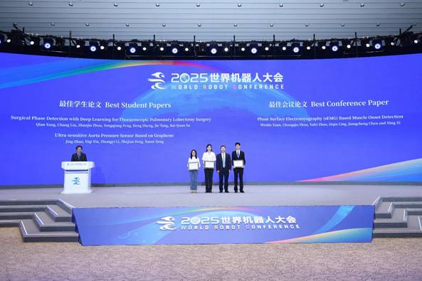 2025世界機器人大會“先進機器人與自動化國際學術會議”共收到來自中國、法國、美國、新加坡等10個國家的87篇論文。經過前期盲審和現場答辯等嚴格評審流程,評選出“最佳學生論文”——《基于深度學習的內窺鏡肺葉切除術手術階段檢測》《基于石墨烯的超靈敏主動脈壓力傳感器》和“最佳會議論文”——《基于相位表面肌電信號(sEMG)的肌肉激活起始點檢測》。中國電子學會副理事長兼秘書長、總部黨委書記、世界機器人大會先進機器人與自動化學術會議主席陳英為“最佳學生論文”和“最佳會議論文”作者頒獎。