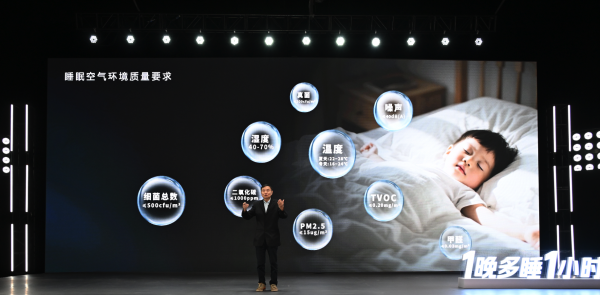 吳教授進(jìn)一步闡述了環(huán)境優(yōu)化的兩個(gè)關(guān)鍵方面:首先,適宜的溫濕度控制對(duì)睡眠和健康至關(guān)重要。海信新風(fēng)空調(diào)通過溫濕度精準(zhǔn)控制、柔風(fēng)防直吹以及16分貝呼吸般靜音等創(chuàng)新技術(shù),為用戶營造出更舒適的睡眠環(huán)境;其次,控制室內(nèi)污染物也是改善睡眠的關(guān)鍵。二氧化碳濃度是室內(nèi)空氣質(zhì)量的最重要指標(biāo),其升高往往伴隨顆粒物、細(xì)菌、裝修污染物及異味等有害物質(zhì)的增加,海信新風(fēng)空調(diào)可以有效降低二氧化碳濃度,提供增氧好空氣,從而改善睡眠環(huán)境,起到顯著的助眠效果。