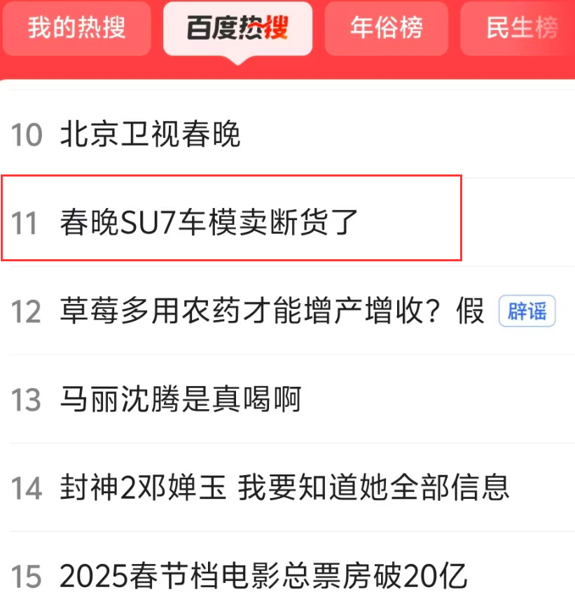 “春晚SU7車模賣斷貨了”沖上百度熱搜
