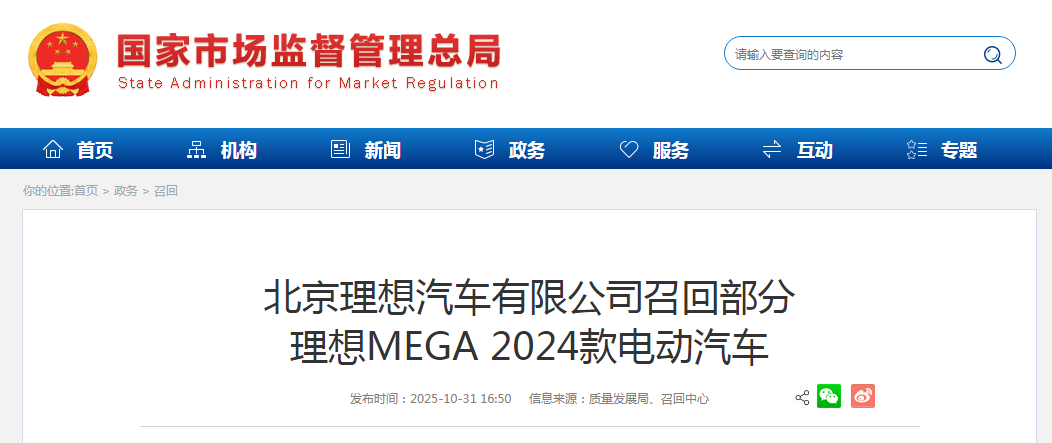 家電消費網(wǎng)11月3日訊 昨天,北京理想汽車有限公司根據(jù)《缺陷汽車產(chǎn)品召回管理條例》和《缺陷汽車產(chǎn)品召回管理條例實施辦法》的要求,主動向國家市場監(jiān)督管理總局備案了召回計劃。召回編號S2025M0174V:自2025年11月7日起,召回生產(chǎn)日期從2024年2月18日至2024年12月27日的理想MEGA 2024款汽車,共計11411輛。