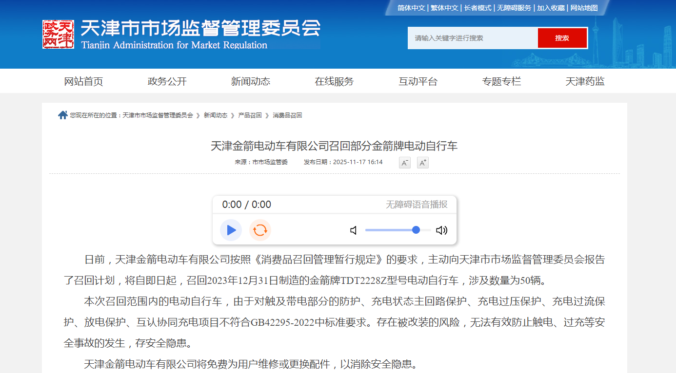 導讀: 家電消費網11月18日訊 昨天,天津金箭電動車有限公司按照《消費品召回管理暫行規定》的要求,主動向天津市市場監督管理委員會報告了召回計劃,將自即日起,召回2023年12月31日制造的金箭牌TDT2228Z型號電...