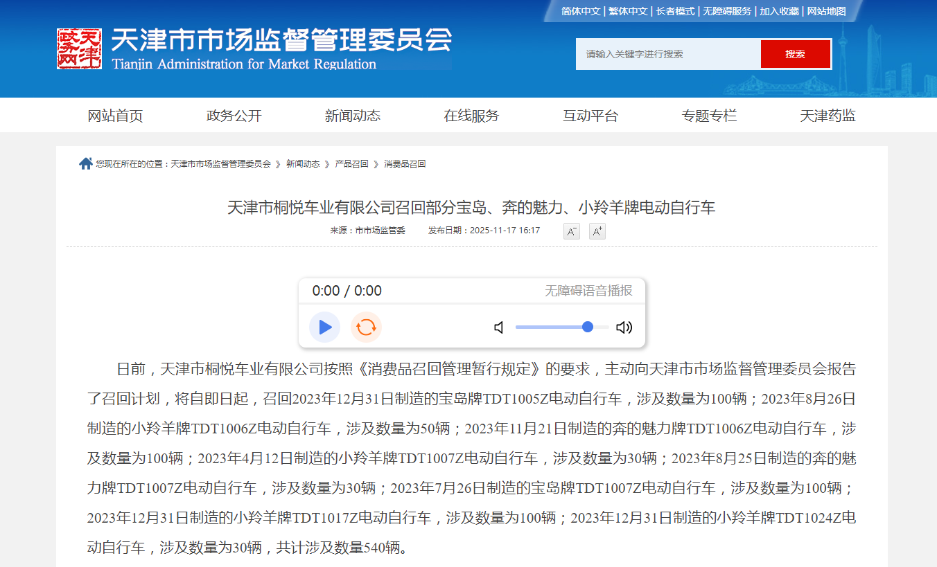 導讀: 家電消費網11月19日訊 昨天,天津市桐悅車業有限公司按照《消費品召回管理暫行規定》的要求,主動向天津市市場監督管理委員會報告了召回計劃,將自即日起,召回2023年12月31日制造的寶島牌TDT1005Z電動自行...