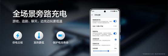 在充電體驗上,本次還帶來了改變用機習慣的黑科技——全場景旁路充電。在邊玩邊充基礎上,全面優化追劇、導航等場景體驗,邊用邊充不發燙,有效保護電池壽命,并支持多適配器快充協議。
