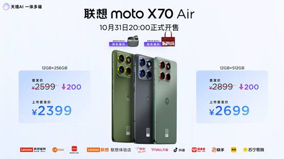 聯想moto X70 Air AI手機售價2599元起,10月31日晚8時全渠道正式開售,首銷福利限時優惠僅2399元起,還可享國補和平臺補貼等多重優惠。