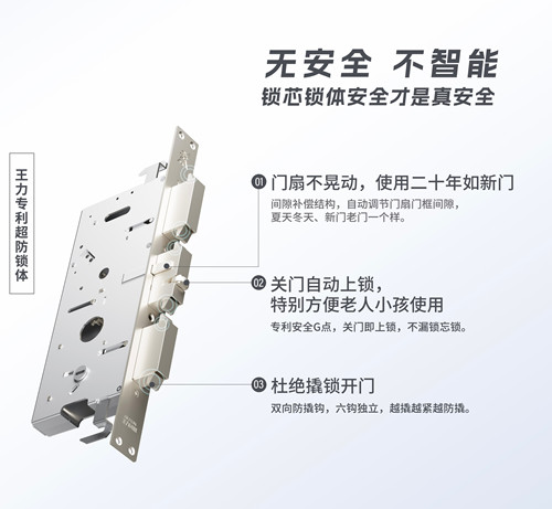 在鎖體方面,王力的超防鎖體通過集成專利安全G點、六重專利防撬鉤及自動間隙補償系統,實現了“關門即自動上鎖”的便捷操作,徹底杜絕了忘鎖、漏鎖帶來的安全隱患。其“越撬越緊”的主動防御機制與“使用20年不變形”的耐用性穩定性,為現代家庭構筑起“不怕忘、撬不開、用不壞”的立體安防屏障。