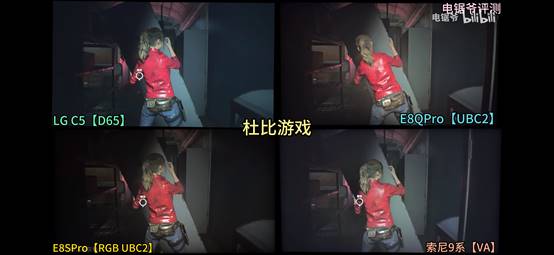 而在亮度和對比度方面,RGB-Mini LED的表現同樣出色。首先是亮度上,在海信E8S Pro最高9360個背光分區和6200nits峰值亮度的絕對優勢面前,OLED自身亮度偏低的短板盡顯。其次是對比度上,OLED一直以黑場純凈著稱,但海信E8S Pro卻能通過108bits的精準控制,做到高亮場景耀眼而不刺眼,暗場表現更是不遜色于OLED,例如這組杜比游戲的對比中,海信E8S Pro對黑暗的深邃感營造就比LG C5更出色。
