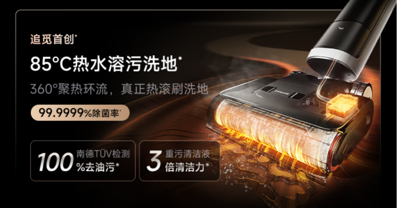 自洗地機產(chǎn)品誕生以來,地面清潔能力始終是用戶選購的核心指標(biāo),也是行業(yè)產(chǎn)品技術(shù)實現(xiàn)迭代創(chuàng)新的關(guān)鍵突破點。不過,追覓科技深入洞察用戶需求發(fā)現(xiàn),傳統(tǒng)的冷水洗地機除頑漬、殺菌效果比較差,而市面上參差不齊的熱水洗地產(chǎn)品,也普遍存在水溫加熱慢、地刷出水不均勻、保溫性差等缺點。于是,追覓科技以消費者需求為導(dǎo)向,相繼攻克散熱阻燃、熱量控制、安全防護設(shè)計等技術(shù)難題,85℃熱水溶污洗地技術(shù)應(yīng)運而生。